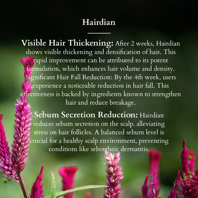 - Hairdian strengthens hair roots, preventing breakage and hair fall, while nourishing the hair from root to tip, ensuring strong and healthy strands.