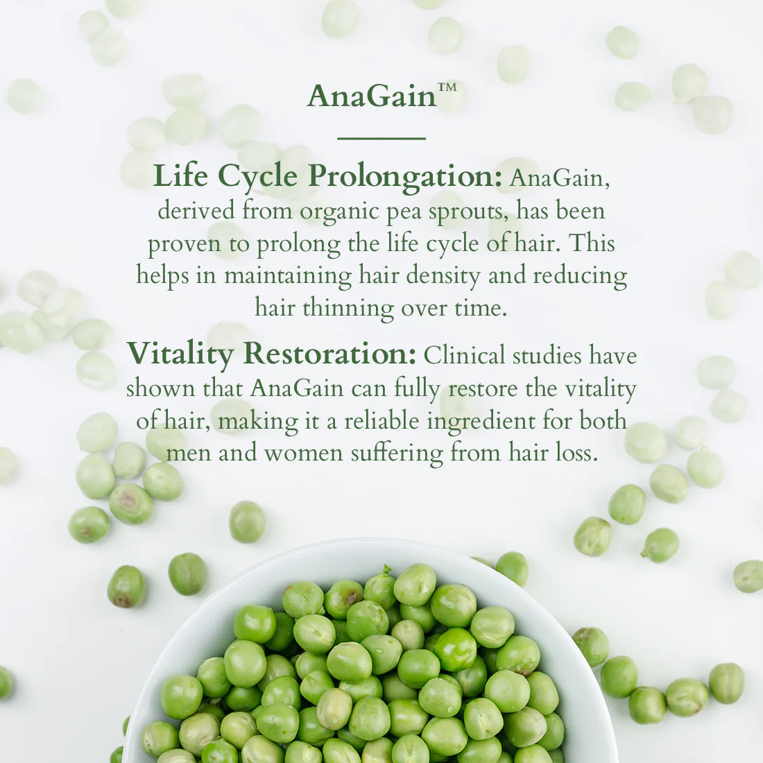 AnaGain™: This patented ingredient is derived from pea (Pisum sativum var. arvense) extracts and helps reactivate hair growth by stimulating the dermal papilla cells. Studies have shown that AnaGain™ can increase hair density and reduce hair thinning in just a few weeks.