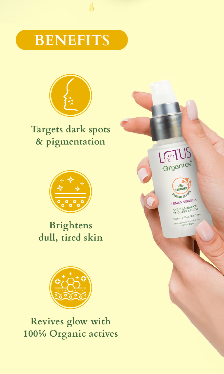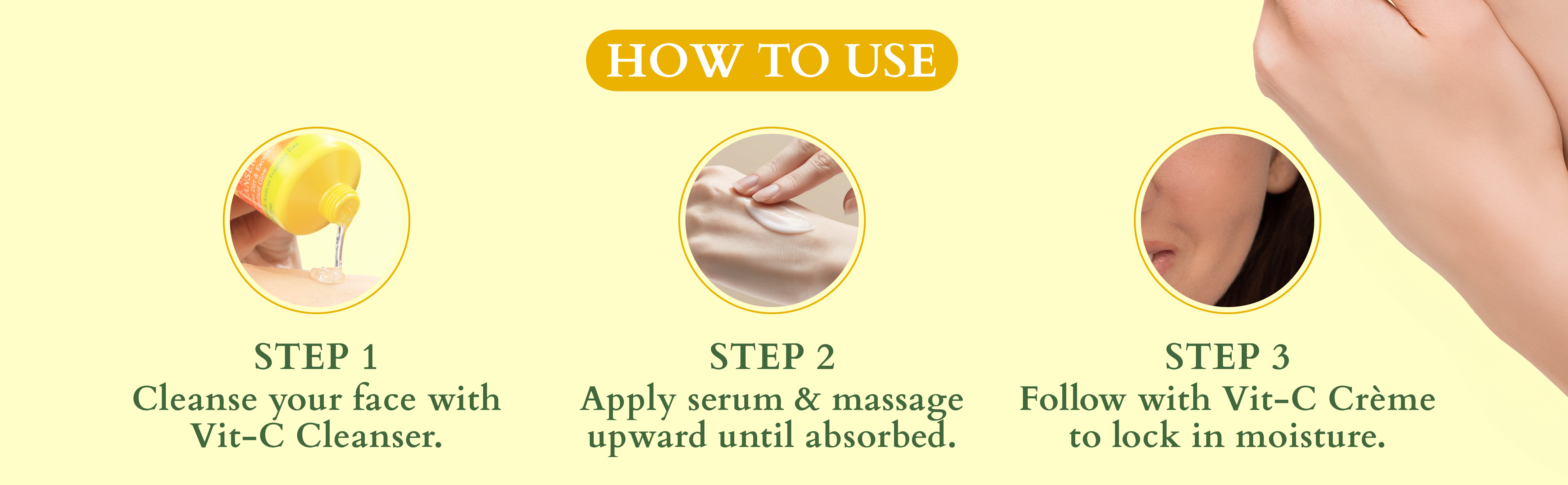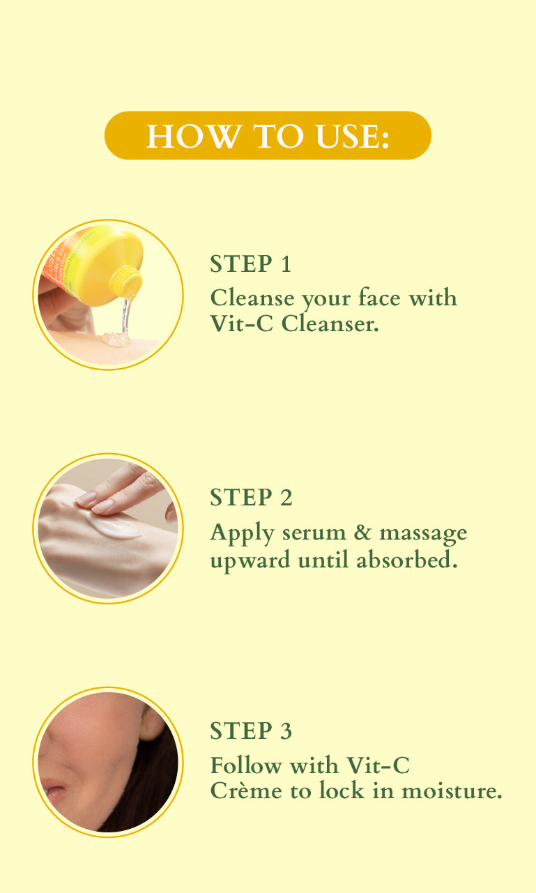 โข Use Vit-C Radiance Booster Cleanser to cleanse your face deeply. โข Gently press dots of Vit-C Radiance Booster Serum onto your forehead, cheeks, nose, and chin. โข Using your fingertips, massage the serum in an upward motion until completely absorbed. โข Lock in the luminous glow, and apply Vit-C Radiance Booster Crรจme SPF 20.