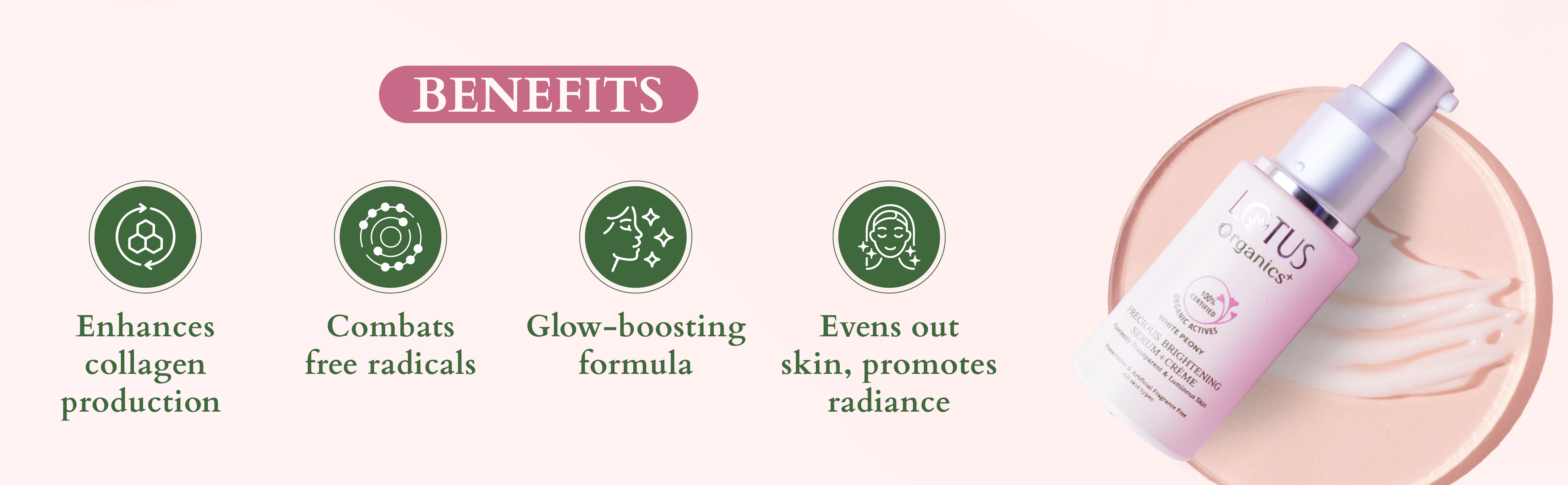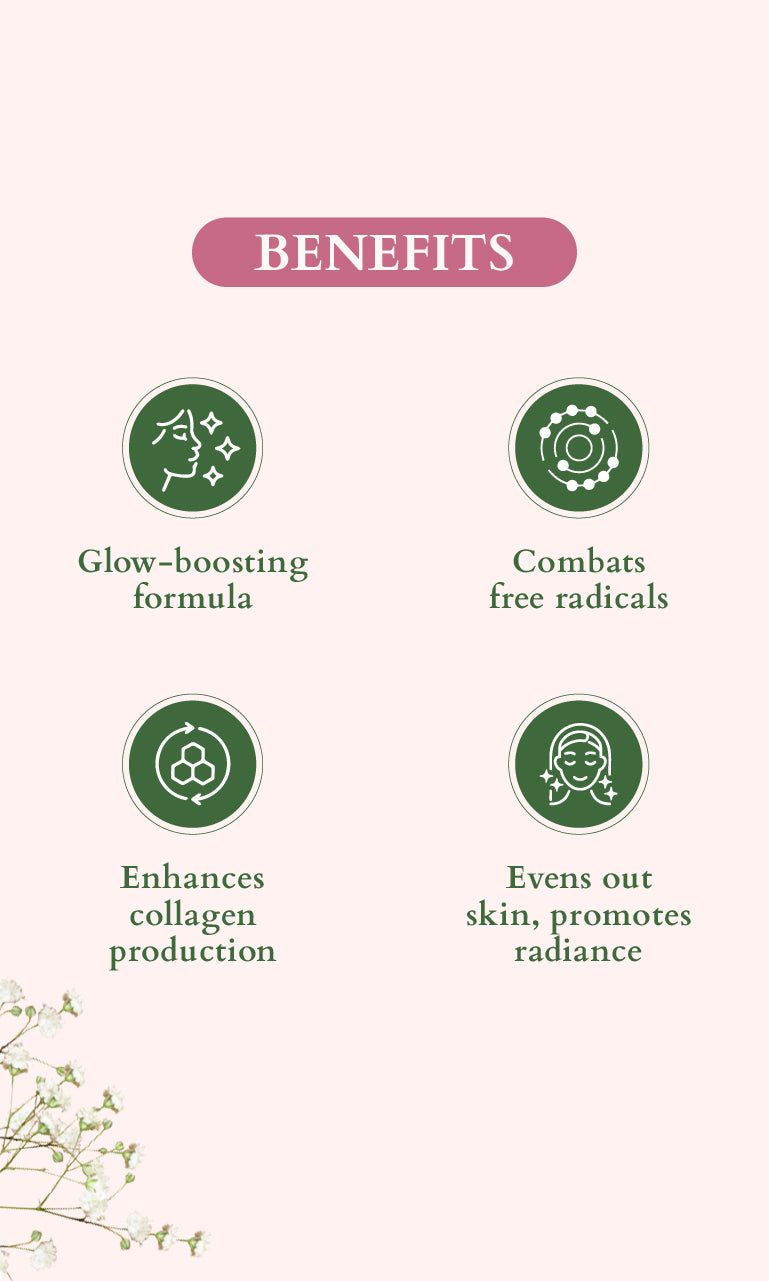 • Boosts collagen production • Treats uneven skin tone • Fights free radicals • Glow Boosting Formula