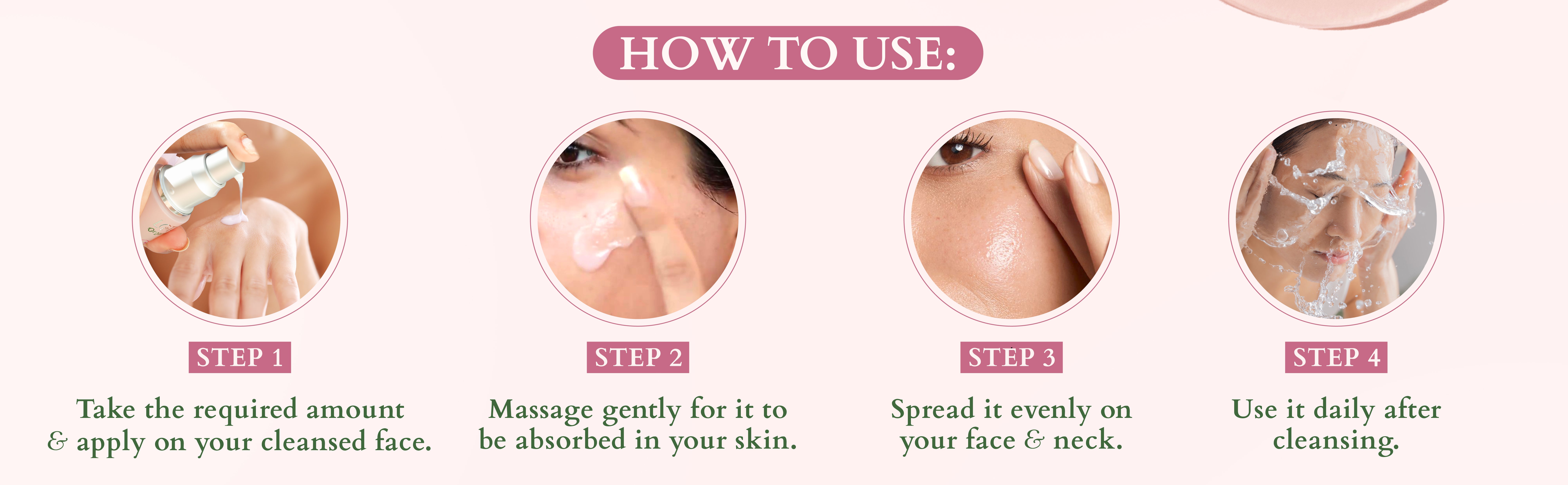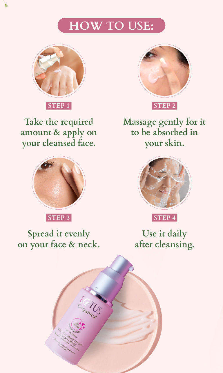 • Wash dirt and grime off your face with Precious Brightening Face Wash. • Spread the Serum+creme evenly across your face and neck and massage until absorption. • Use twice a day for the best results.