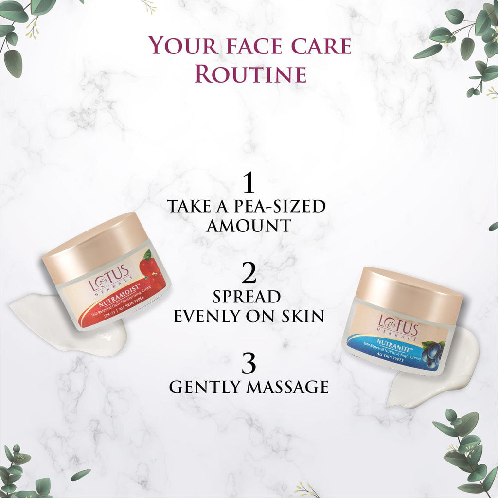 At Night: Before sleeping use "Nutranite Creme" to replenish the skin cells. Apply it all over your face and neck to moisturize for a final finish.