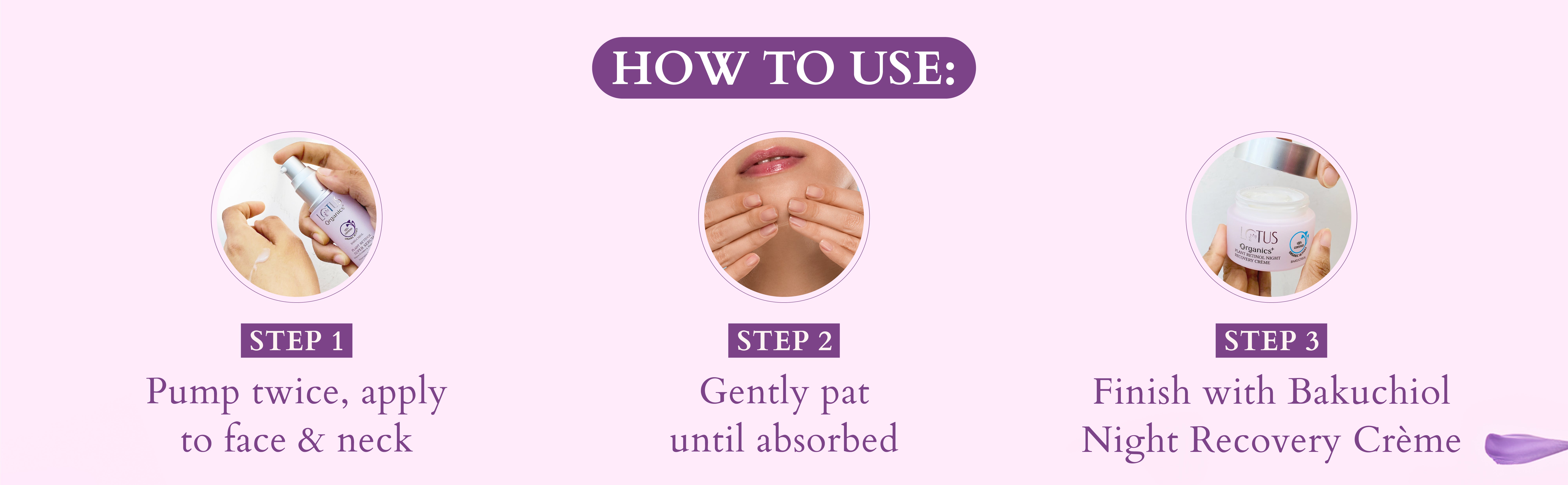 A: Adding Bakuchoil to your skincare routine is easy, especially when it's Lotus Organics+ Bakuchoil Range! Apply products in the order of thinnest to thickest. Begin by cleansing your face with Bakuchiol Plant Retinol Oil to Foam Cleanser, toning, and patting 2-3 hydrating drops of Bakuchiol Plant Retinol Super Serum. Now lock in all the goodness with Bakuchiol Plant Retinol Recovery Crème, a luxurious crème that deeply hydrates, improves skin texture, and restores a radiant glow, leaving your skin pampered and revitalised.