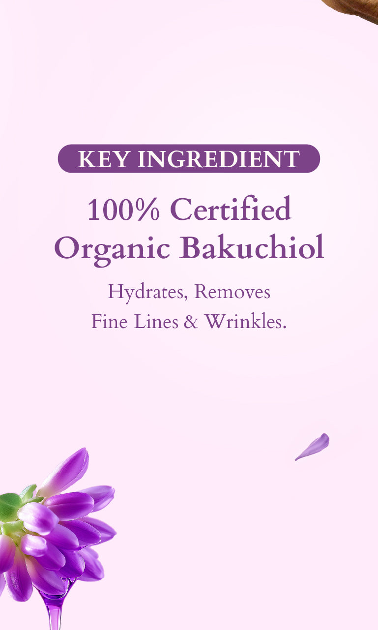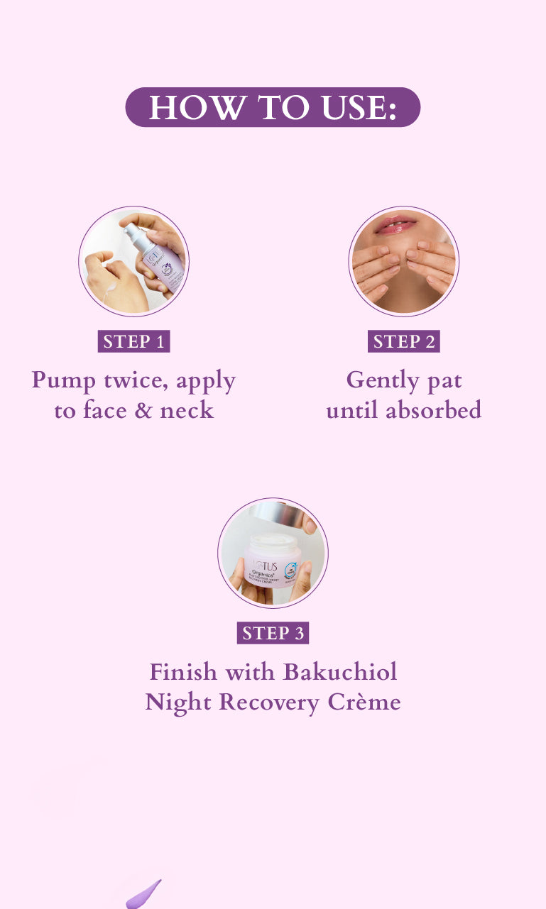 • Dispense two pumps to generously cover your face and neck. • Gently pat Bakuchoil Plant Retinol Super Serum on a clean & dry face. • Allow the product to absorb before applying other skincare products. • Follow it up with Bakuchoil Plant Retinol Night Recovery Crème.