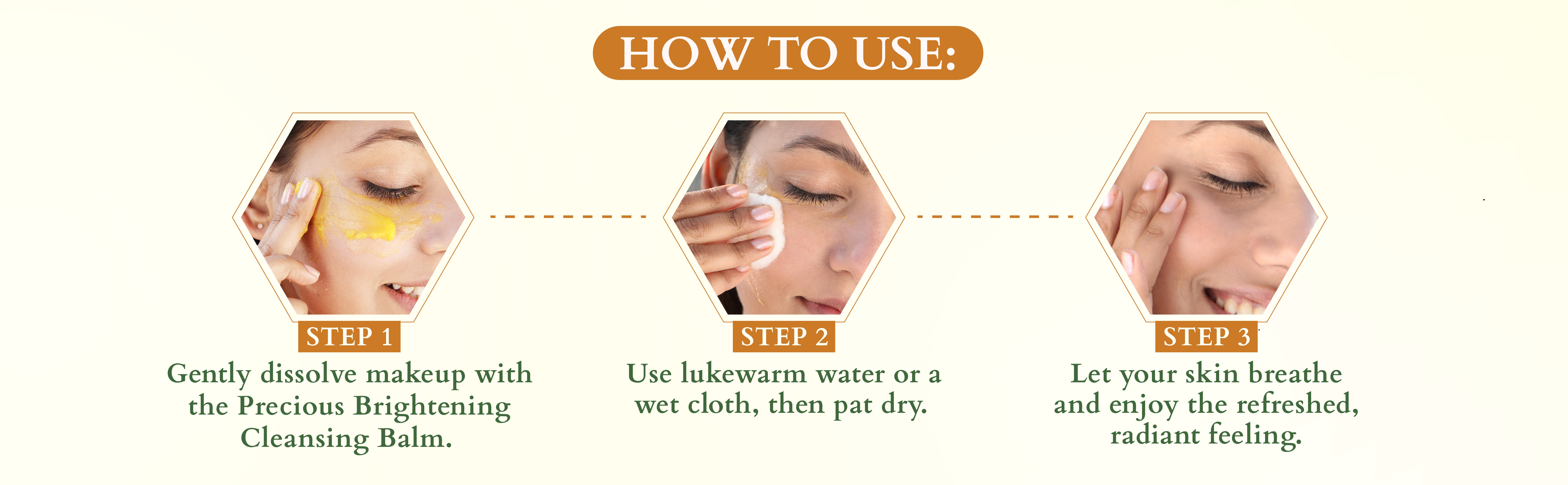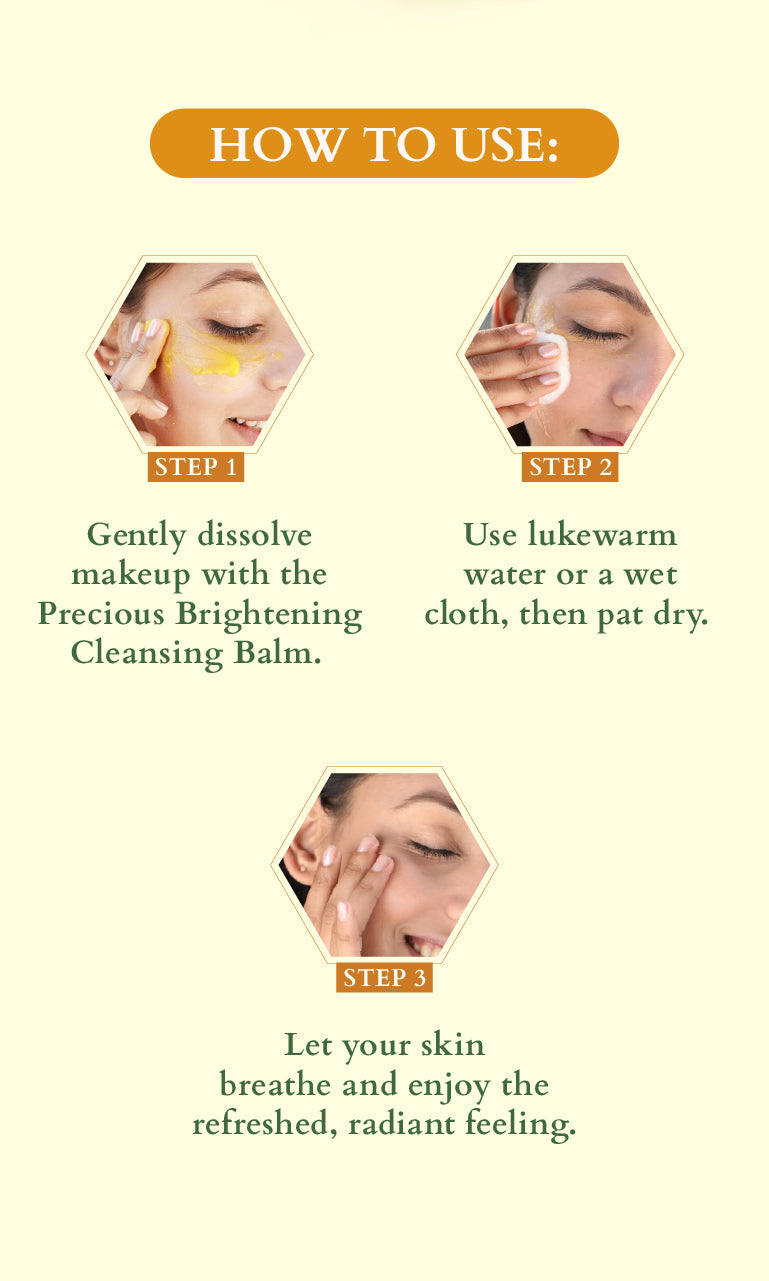• Gently massage Precious Brightening Cleansing Balm on the skin until it dissolves makeup entirely. • Rinse off with lukewarm water or a wet cloth, and pat dry. • Pat dry. Follow up with Precious Brightening Face Wash, Precious Brightening Toner Essence, and Precious Brightening Night Crème.