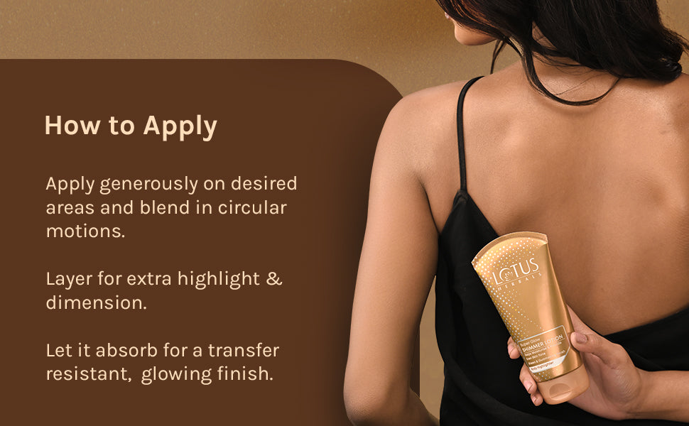 Apply generously on desired areas just like any other body lotion and blend in preferably with a body brush. Layer for extra highlight and dimension. Let it absorb for a transfer-resistant, glowing finish.